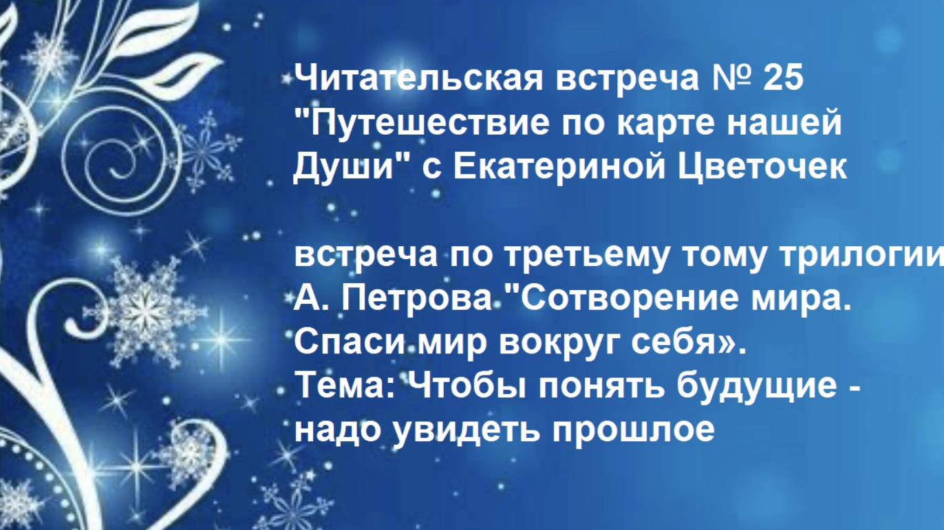 Сайт Аркадия Петрова / интернет-магазин: https://kulturabooks.ru Читаем книги по порядку: https://kulturabooks.ru/product-category/knigi-arkadiya-petrova/chitaem-knigi-po-poryadku-glavnaya/ Присоединяйтесь! И познавайте Себя вместе с "Древо Жизни! Мы в Telegram: https://t.me/+HiyUWFMr9jswMWU6 Читательская встреча № 25 "Путешествие по карте нашей Души" с Екатериной Цветочек встреча по третьему тому трилогии А. Петрова "Сотворение мира. Спаси мир вокруг себя». Тема: Чтобы понять будущие - надо увидеть прошлое Продолжаем наше путешествие! Друзья, приглашаем вас на открытые читательские встречи познакомиться с книгами Аркадия Петрова по учению "Древо Жизни"! Читаем, обсуждаем тексты, делаем простую практику по нормированию здоровья и событий. Цель наших занятий совместное проживание смыслов заложенных в книги, благодаря которым многие люди на планете обретают новое миропонимание, оздоравливаются, нормируют события. Встречаемся 1-2 раза в месяц по четвергам, трансляция через ZOOM и группах ВКонтакте НАМ НУЖНА ВАША ОБРАТНАЯ СВЯЗЬ! ДЕЛИТЕСЬ В ЧАТАХ! Telegram основная страница с информацией о предстоящих мероприятиях: Оставайтесь с нами в центре событий! присоединяйтесь к нам в Telegram: t.me/PetrovPushkinoKultura Официальные сайты Аркадия Петрова: https://arkadypetrov.ru https://древожизни1.рф книги: https://kulturabooks.ru ВКонтакте страница Аркадия Петрова: https://vk.ru/a.petrov46 ВКонтакте страница издательства Культура: https://vk.ru/club214534862