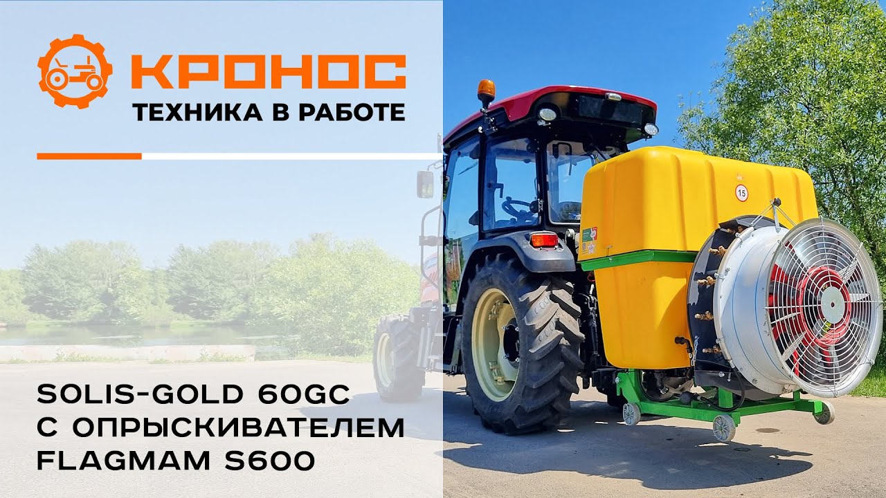 Трактор Solis-gold 60GС с опрыскивателем Flagman в работе