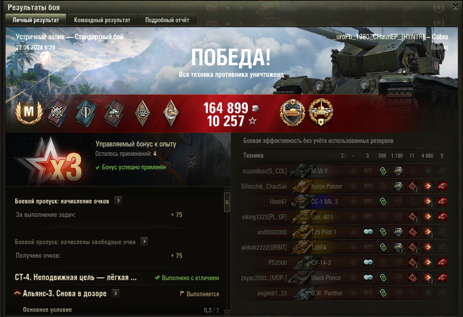 УСТРИЧНЫЙ ЗАЛИВ МАСТЕР на Cobra ОПЫТ: 1354 СУММАРНЫЙ УРОН: 5578 медаль ОСНОВНОЙ КАЛИБР