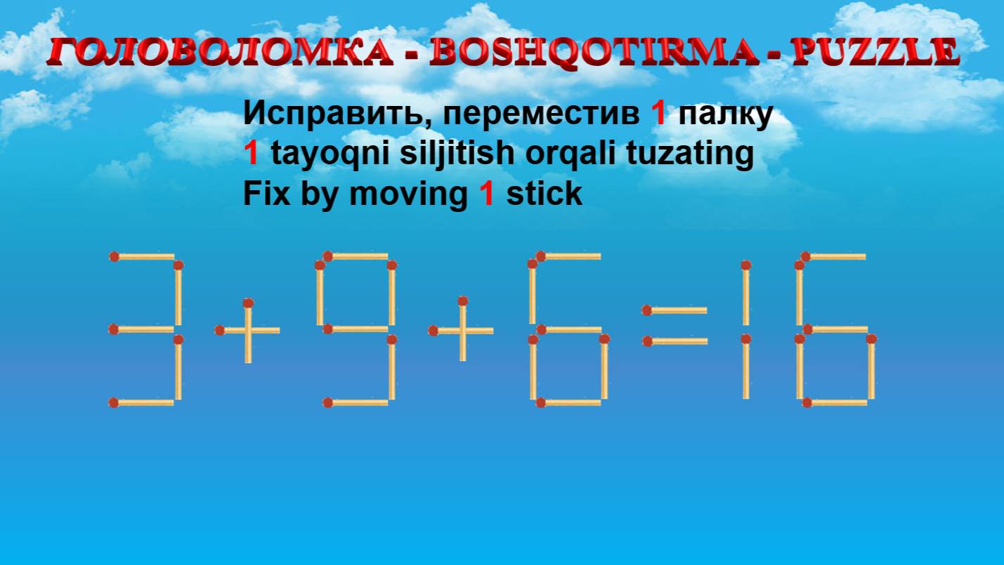 ГОЛОВОЛОМКА - BOSHQOTIRMA – PUZZLE. Спичка. 3+9+6=16, 5-3+8=9, 1+9-3=9, 8-2-8=5