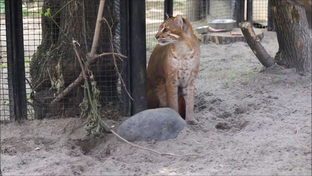 Новосибирский зоопарк получил пару этих необычных в 2017 году. Это уже взрослые самец и самка, по оценкам наших зоологов им было примерно по пять лет. До передачи в зоопарк они содержались в частной коллекции. Азиатские золотистые кошки активны в вечернее и ночное время. К тому же они очень осторожны и скрытны, особенно если всё кругом новое: обстановка, запахи, люди. Азиатских золотистых кошек также называют кошками Темминка. Опыта содержания кошек Темминка у зоопарков очень мало. У нас представители вида недолго содержались в начале 80-х годов прошлого века. Ни в одном российском зоопарке таких кошек нет, в европейских зоопарках их буквально несколько особей. В 2023 году приехала новая пара таких кошек.