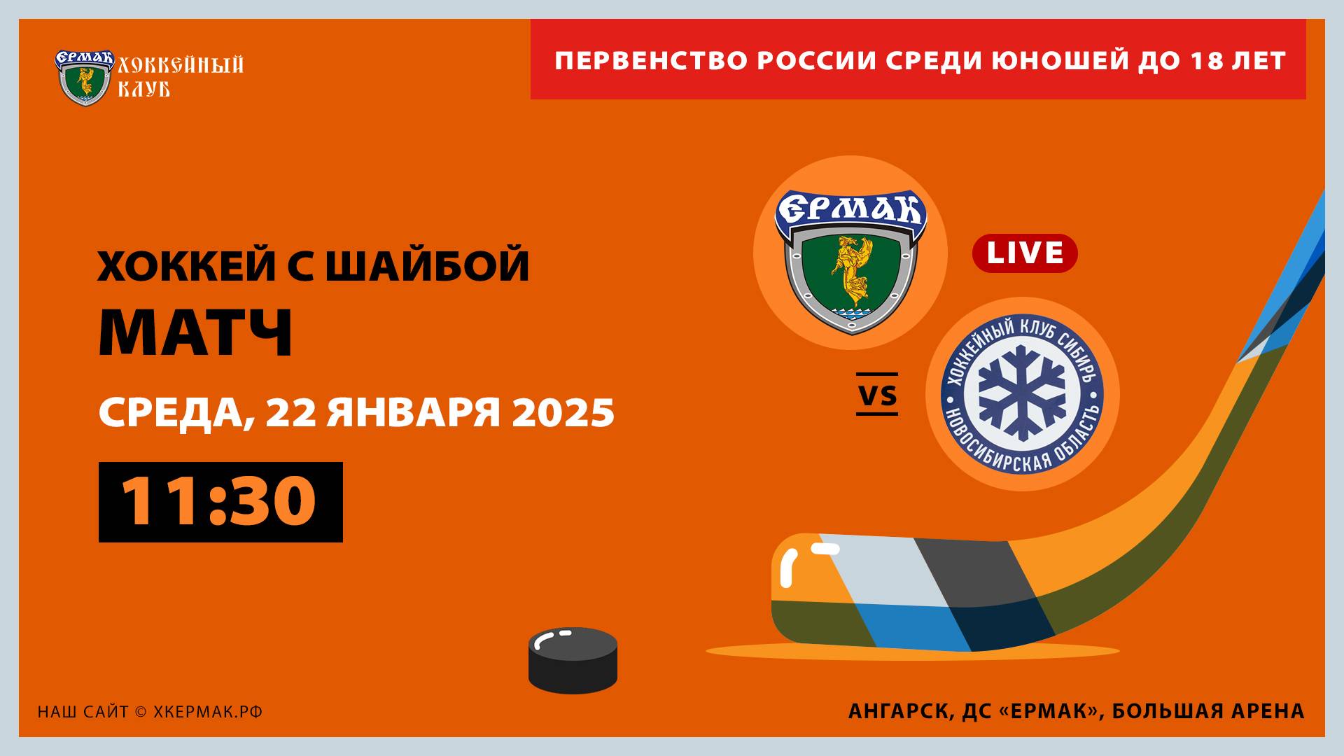 Первенство ЮХЛ по хоккею среди юношей до 18 лет. Матч между командами «Ермак» (Ангарск) и «Кристалл» (Южно-Сахалинск). 22 января 2025 г., .г Ангарск, ДС «Ермак»