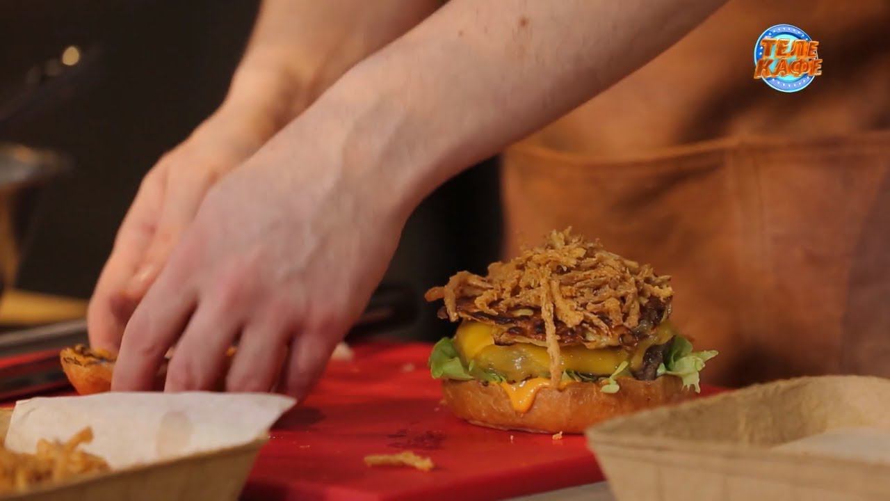 Шеф-повар Максим Кузнецов знает, как придать бургеру истинно русский колорит. Бургер с картофельным драником : фарш говяжий, булочка, картофель, яйцо, мука, сыр, листья салата, лук-фри, майонез, кетчуп, уксус, соус табаско, сахар, соль, перец, соус ворчестер