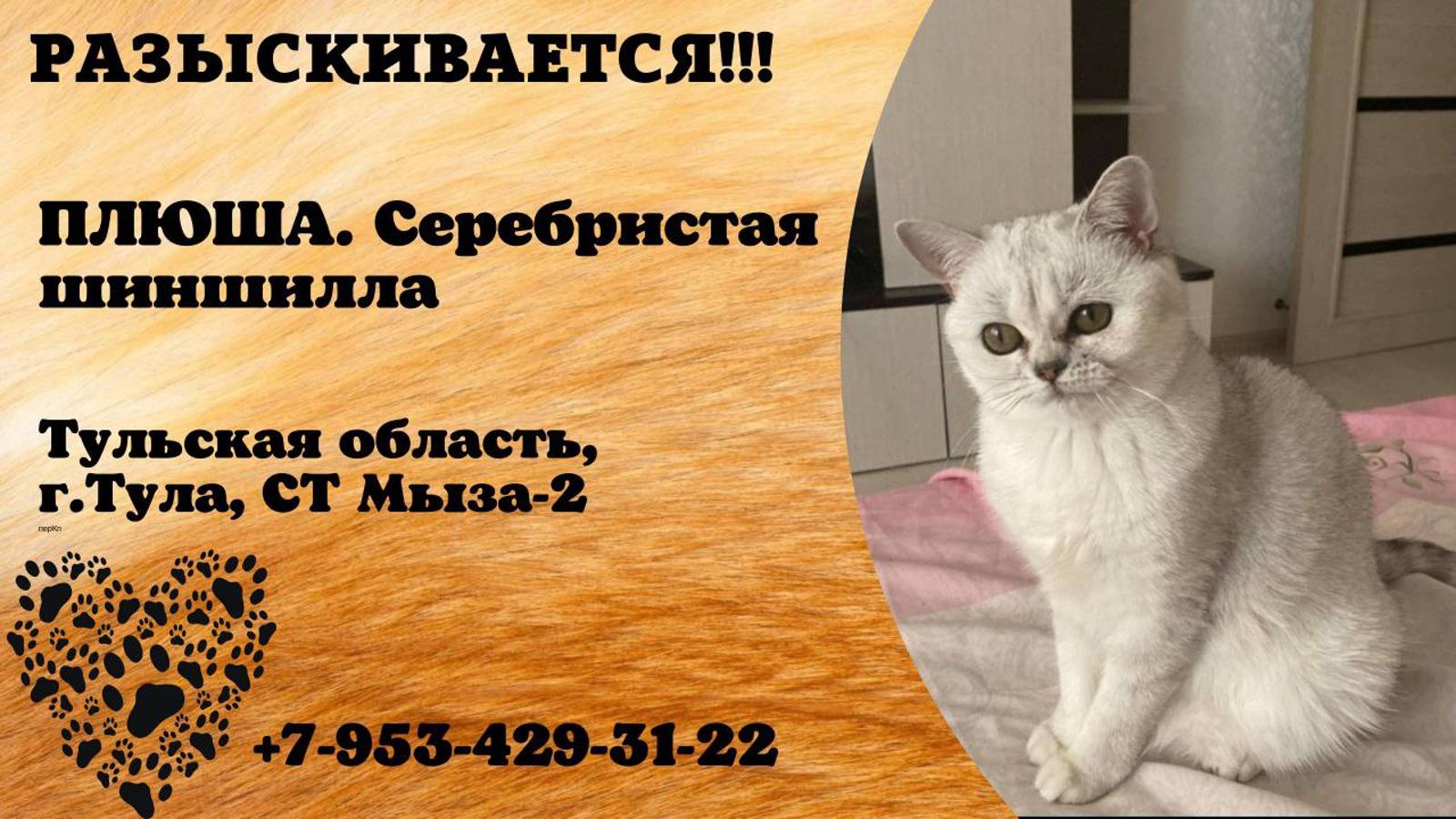 Тульская Тула Пропала кошка Пропала кошечка, серебристая шиншилла. Откликается на имя-Плюша,Плюшка. Пропала в районе СТ Мыза-2, 15.09.2024. Нашедшего огромная просьба позвонить по номеру телефона 89534293122-Валерия. Автор https://vk.com/valeriazhukova2001 Инфо https://vk.com/wall-198815410_153235
