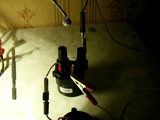 Качер + сухая катушка зажигания с двумя высоковольтными выходами. Подключена вместо обычных циллиндрических катушек качера. Шарик из фольги бьётся от высоковольтного разряда. Проволочки подключенных к "горячему" и "холодному" концам высоковольтной обмотки. Шарик одет на "горячий" конец.