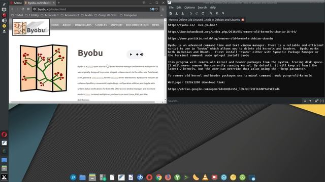 How to Delete Old Unused Kernels in Debian and Ubuntu http://byobu.co/ bee-yo-boo? http://ubuntuhandbook.org/index.php/2016/05/remove-old-kernels-ubuntu-16-04/ https://www.pontikis.net/blog/remove-old-kernels-debian-ubuntu Byobu is an advanced command line and text window manager. There is a reliable and efficient script to use in “byobu” which allows you to delete old kernels and headers. Byobu works both in Debian and Ubuntu. First install "byobu" either with Synaptic Package Manager or the terminal command: sudo apt-get install byobu This program will remove old kernel and header packages from the system, freeing disk space. It will never remove the currently running kernel. By default, it will keep at least the latest 2 kernels, but the user can override that value using the --keep parameter. To remove old kernel and header packages use terminal command: sudo purge-old-kernels Wallpaper 1920x1200 download link: https://drive.google.com/open?id=1KQbrvS7_lDWJeCTZSFOLbNPYoPxEEsdA