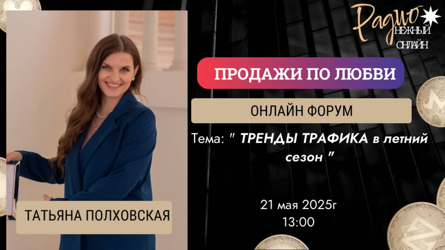 ТРЕНДЫ ТРАФИКА в летний сезон "- Радио Нежный Онлайн ©️Татьяна Полховская (https://t.me/+B25IVXyy-rRiMTAy) - бизнес тренер по продажам через выступления и управлению репутацией Форум: ПРОДАЖИ ПО ЛЮБВИ (https://app.leadteh.ru/w/C6Fn) на радио “Нежный онлайн” Подарок Сегодня мы дарим УРОК, КАК СОЗДАТЬ ВХОДНОЙ ПРОДУКТ, который будет продаваться https://t.me/kuhnya_expertov/4693 И в пятницу в закрытом эфире,расскажу шаги для достижения цели : работать с лидерами мнений _______________________________________ 🎙Если вы хотите стать спикером радио, попасть на подкаст, пишите 👉 сюда (https://t.me/m/sApQQFV0ZDgy)