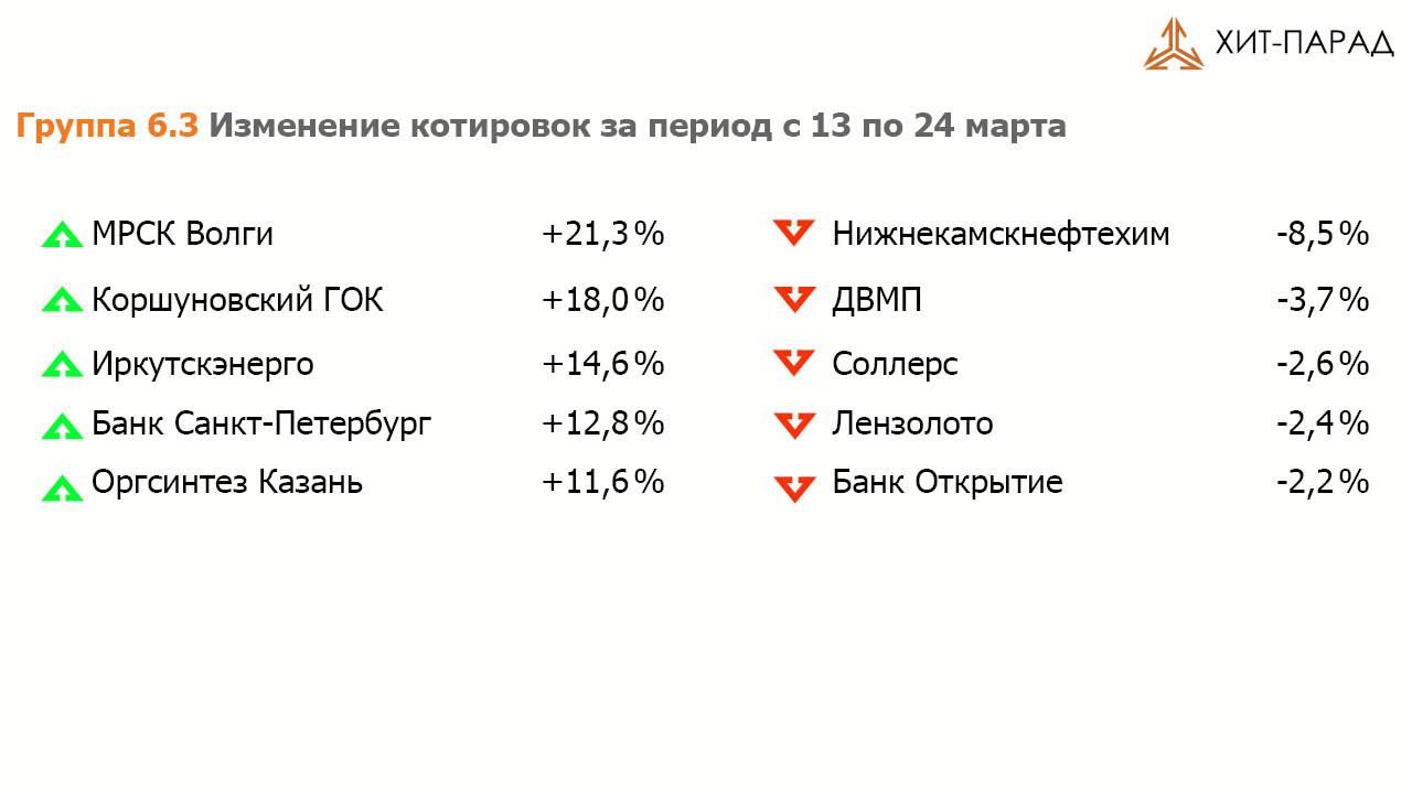 Здравствуйте, уважаемые зрители! С Вами в студии - Артем Абалов. Вашему вниманию предлагается традиционный обзор торгов на российском рынке акций за период с 13 по 24 марта 2017 года. За прошедшие 2 недели индекс ММВБ вырос на 3,3% до отметки 2 039 пунктов. Активность операторов рынка в отчетном периоде оставалась на среднем уровне. Посмотрим, кто стал лидерами роста и снижения в разрезе традиционных групп акций. Группа 6.1 Пятерку лидеров возглавили обыкновенные акции ИНТЕР РАО, показавшие рост почти на 15,0%, а также ММК, выросшие на 13,6%. Рост в указанных акциях во многом обусловлен техническими причинами, а именно – серьезным снижением их котировок в предыдущем отчетном периоде. Росту котировок МТС не помешали достаточно скромные годовые финансовые результаты; инвесторы надеются на продолжение реализации компанией программы выкупа собственных акций. Акции АЛРОСы прибавили 11,7% после выхода отчетности за прошедший год; дополнительно интерес к бумагам вызвали новости о возможном увеличении дивидендных выплат. Котировки Российских сетей прибавили 12,4%: дочерние компании холдинга по итогам прошедшего года в целом отчитываются с превышением ожиданий инвесторов, что может предвещать хорошие консолидированные результаты. В аутсайдерах группы оказались акции нефтяных компаний – Лукойла, Роснефти и Башнефти, показавших динамику хуже рынка на фоне снижения мировых цен на нефть. Компанию им составили показавшие хорошую динамику в предыдущем периоде акции РусГидро и Северстали на фоне отсутствия значимых корпоративных событий. Группа 6.2 В группе 6.2 лидером оказались акции ТГК-1, частично восстановившиеся после выхода слабой отчетности по итогам прошедшего года. Компанию им составили бумаги Аэрофлота, прибавившие почти 12% на фоне нейтральных операционных результатов по итогам двух месяцев текущего года.В пятерке лидеров присутствуют два представителя металлургической отрасли – Распадская и Мечел. Распадская выпустила достаточно хорошую отчетность по итогам прошедшего года. Инвесторы надеются, что благополучный четвертый квартал положительным образом скажется и на годовых результатах Мечела. В пятерке лидеров также – акции Юнипро, прибавившие 7,5% на фоне вышедшей отчетности за 2016 год. В пятерку аутсайдеров вошли бумаги Группы компаний ПИК на фоне новостей о делистинге акций с Лондонской биржи. Компанию им составили лидеры роста предыдущего отчетного периода акции М-Видео и Полюс-Золото. Динамику хуже рынка показали акции Акрона на фоне укрепления рубля. Акции Группы ЛСР практически не изменились в цене на фоне вышедшей отчетности, отразившей снижение чистой прибыли и собственного капитала на акцию. Группа 6.3 В группе 6.3 пятерку лидеров возглавили акции МРСК Волги, на фоне вышедшей отчетности за 2016 год, отразившей рекордную чистую прибыль. Второй раз подряд в числе лидеров оказались акции Коршуновского ГОКа и казанского Оргсинтеза, по которому Совет директоров принял решение о выплате существенных дивидендов по обыкновенным акциям. Акции Иркутскэнерго прибавили 14,6% на новостях о подаче заявления Центральным банком в суд к ООО «Тельмамская ГЭС» с требованием исполнить предписание по выставлению оферты миноритарным акционерам. Среди лидеров также акции банка Санкт-Петербург, по которому в ближайшие дни ожидается выход конс