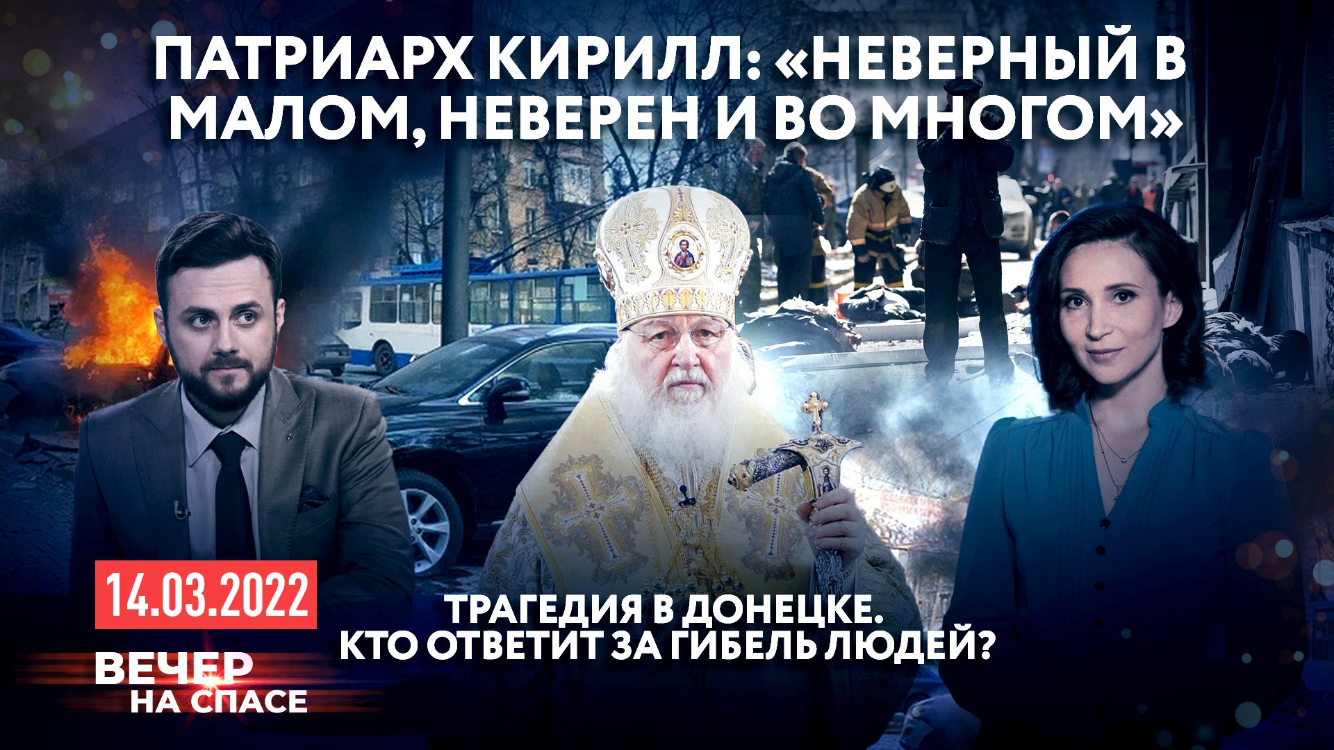 ⚡️В выпуске 14.03.22: ? 20 мирных жителей погибло в Донецке в результате атаки ВСУ, российская и украинская делегации провели четвертый раунд переговоров, в Москве отменяют масочный режим. Расскажем о главных событиях этого дня. ? "И ныне проклят ты от земли, которая отверзла уста свои принять кровь брата твоего…» Разберем Писание дня с отцом Стахием Колотвиным. ? Дорога памяти. Тысяча четыреста восемнадцать шагов к Победе. Очередной выпуск нашей специальной рубрики о подвиге народа-победителя. ? Апокалипсис вслух. Пятую главу «Откровения святого Иоанна Богослова» прочтет известный актер театра и кино Евгений Стеблов. ? «…неверный в малом неверен и во многом». С гостями в нашей студии мы обсудим проповедь Святейшего Патриарха Кирилла и единство Церкви во время испытаний. ЭТО ВЕЧЕР НА СПАСЕ. ГЛАВНОЕ НА СЕГОДНЯ И… ВСЕГДА.