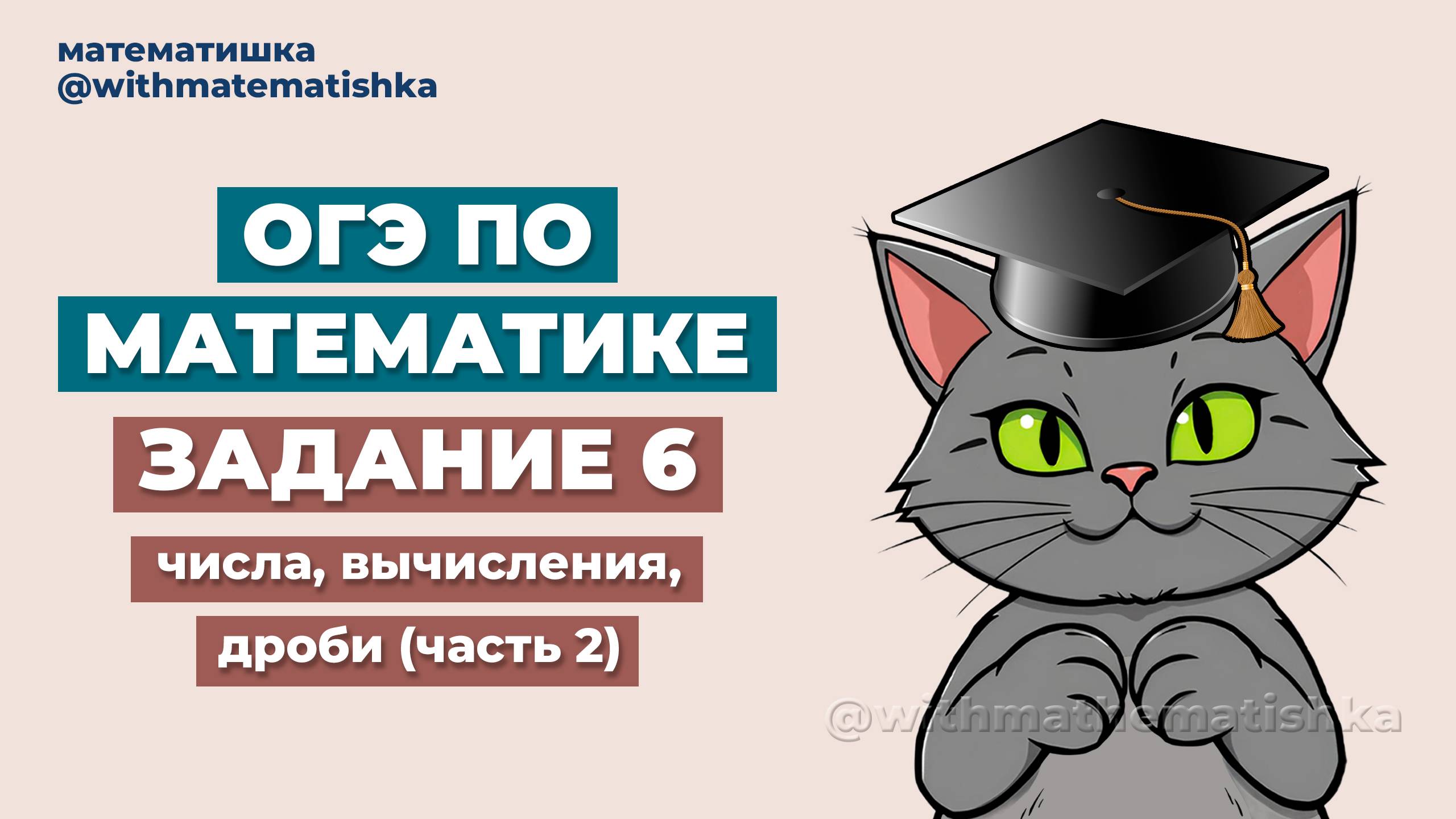 ✍🏻 Видео-разбор заданий из №6 из ОГЭ по математике (числа, вычисления, дроби) 🎬 Первая часть видео: https://vk.com/video-228936550_456239030 📑 Конспект урока ждёт вас в моём Telegram-канале: https://t.me/withmatematishka/45?single 📍 Запись на индивидуальные онлайн-занятия возможна в рамках подготовки к ОГЭ, ВПР, ЕГЭ (только базовый уровень), а также с целью освоения школьной программы с 5 по 11 класс при наличие свободных мест 📖 Более подробную информацию об организации занятий, стоимости обучения и отзывах вы сможете найти в группе ВКонтакте или в Telegram-канале в закреплённых постах ▪️ Telegram: https://t.me/withmatematishka ▪️ ВКонтакте: https://vk.com/withmatematishka Там я также публикую материалы для подготовки к ОГЭ, ЕГЭ и ВПР по математике, статьи и вдохновляющие посты об учёбе и саморазвитии 📩 Для записи на занятия и уточнения наличия свободных мест пишите: ▪️ Telegram: https://t.me/veronimath ▪️ ВКонтакте: https://vk.com/veronimath 👩🏻💻 Автор канала – репетитор по математике с высшим образованием по специальности «учитель математики и информатики» и опытом в онлайн-преподавании более 5 лет ✅ Если вы ученик/ученица и хотите записаться на занятия, обязательно обсудите это с родителями или вашими иными законными представителями для того, чтобы они связались со мной и записали вас на занятия 💌 Спасибо за просмотр! Буду очень рада вашим подпискам и лайкам! ⌚️ Таймкоды: 00:00 – Задание 1 05:05 – Задание 2 07:57 – Задание 3 09:21 – Задание 4 12:09 – Задание 5 14:33 – Задание 6 15:44 – Задание 7 17:08 – Задание 8 20:07 – Задание 9 22:05 – Задание 10 📚 Задания из данного видео взяты с сайта «ФИПИ Открытый банк тестовых заданий», раздел «Математика»: https://oge.fipi.ru/bank/index.php