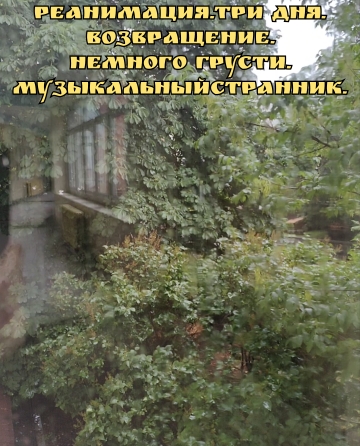 Я не плачу, просто дождь, Настроенье дарит. И печаль, как к "сердцу нож", Вновь меня "кошмарит". Да плевать, Я все же жив. И желаний полон. Отпускаю негатив... Путь судьбы не сломан. Друзья!!!В продолжение вчерашней публикации, сегодня выставляю новый трек.Это видео Я снял в больнице...Когда прогуливался по коридору, уже в отделении хирургии.Внезапно пошел дождь.Как здорово, что со мной был телефон.Когда меня выписали из больницы, на шестой день записал вот такую мелодию.Вышел, как мне кажется интересный клип.Релакс.Всем хорошего Дня!!! Лучшее видео. #реанимация #боль #страх #жизнь #преодоление #грусть #печаль #дождь #настроение #музыка #лучшее #позитив #эмоции #поэзиямузыки #релакс #мечты #желания #чувства #семья #родина #россия #душа #тренды #рекомендации #топ #хит