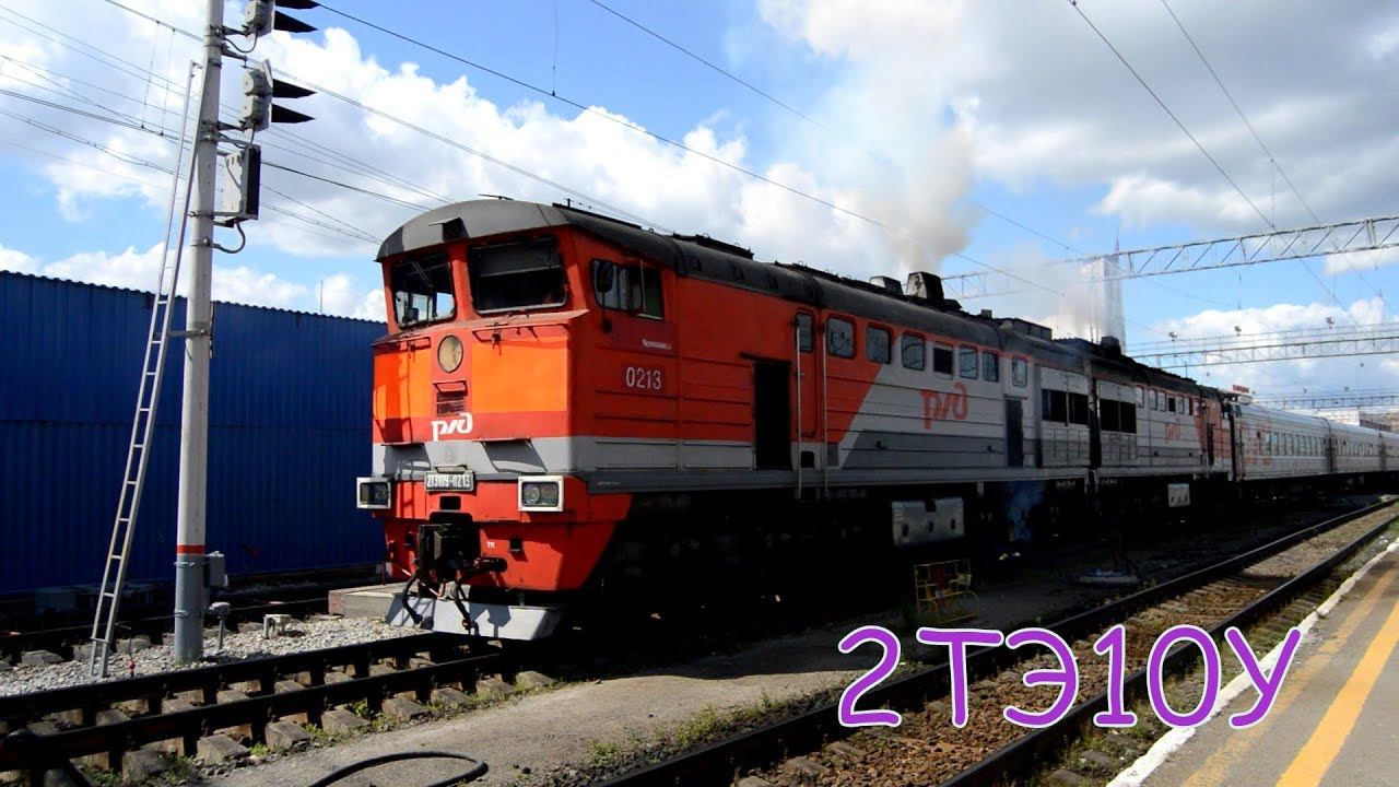 Тепловоз 2ТЭ10У-0213 с поездом 379 Новый Уренгой - Оренбург отправляется со станции Екатеринбург Пас