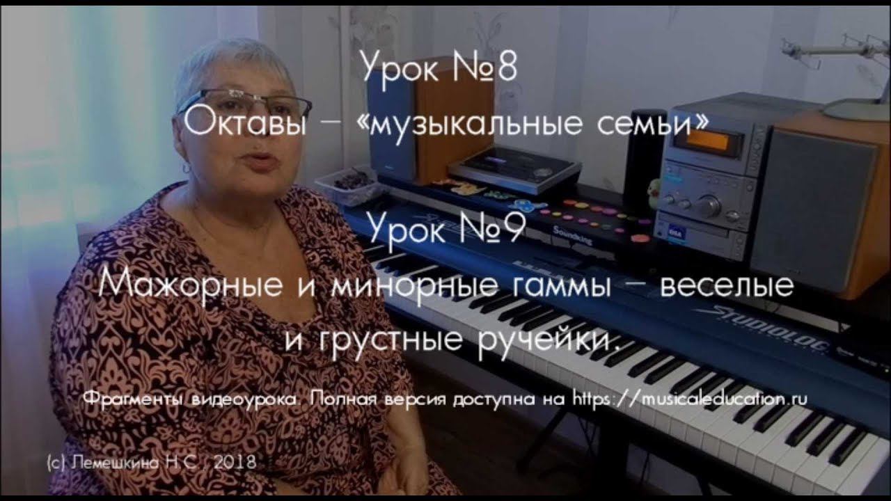 Фрагменты уроков 8 и 9 видеокурса "Обучение игре на фортепиано детей от 2,5 лет" Н.С. Лемешкиной. Урок № 8. Октавы – «музыкальные семьи» Урок № 9. Мажорные и минорные гаммы – веселые и грустные ручейки Подробнее на https://musicaleducation.ru/