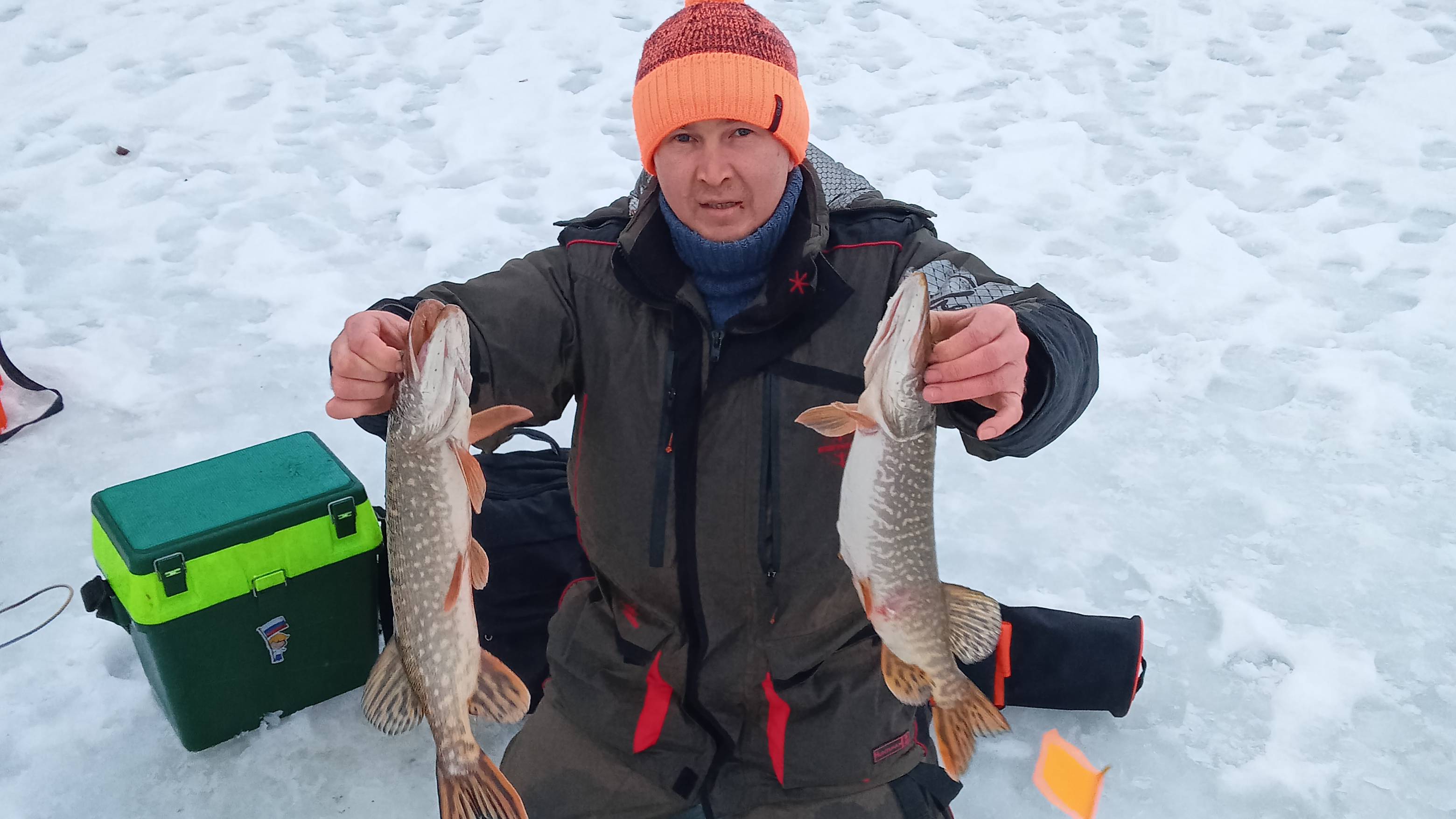 Потепление, температура плюс 2 градуса. Целый день дождь с мокрым снегом. Приехали с друзьями на местный пруд, ловить щуку на жерлицы. Рыбалка удалась, поймали несколько хороших экземпляров.