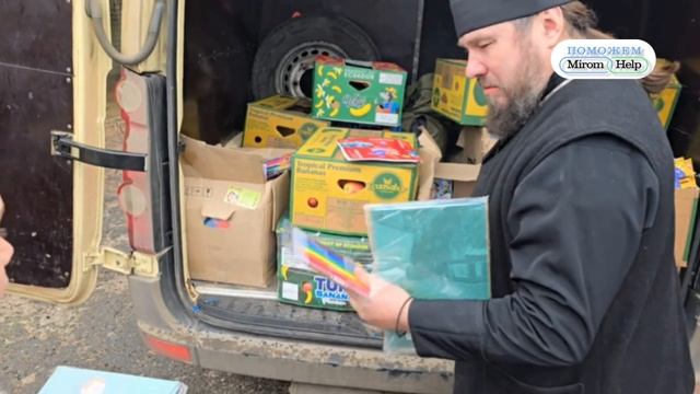 Отец Димитрий Кротков раздаёт детям Херсонской области рождественские подарки