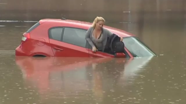 Женщина спасается от наводнения на крыше машины