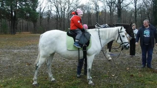 Катаются дети в лесу на лошадях, на плацу осенняя слякоть.