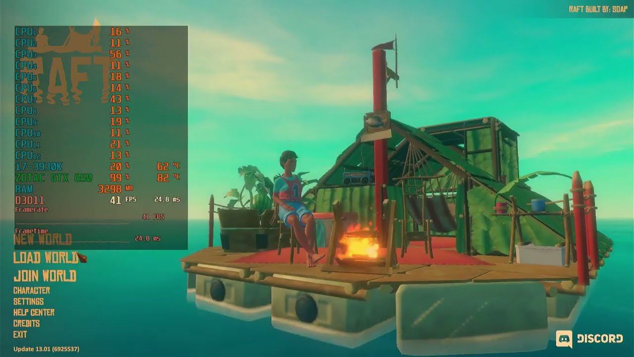 Game: Raft Сomputer characteristics: Socket: LGA 2011 Motherboard: Asus Sabertooth X79 Processor: i7 3930K 3.20GHZ RAM: HYPER X 16GB DDR3-DIMM 1600 GPU: ZOTAC GTX 650 GDDR5 2GB ROM: SSD 128GB+HDD 500GB Video in 1920x1080 resolution. Operating system: Windows 10 Pro --- Timecodes -