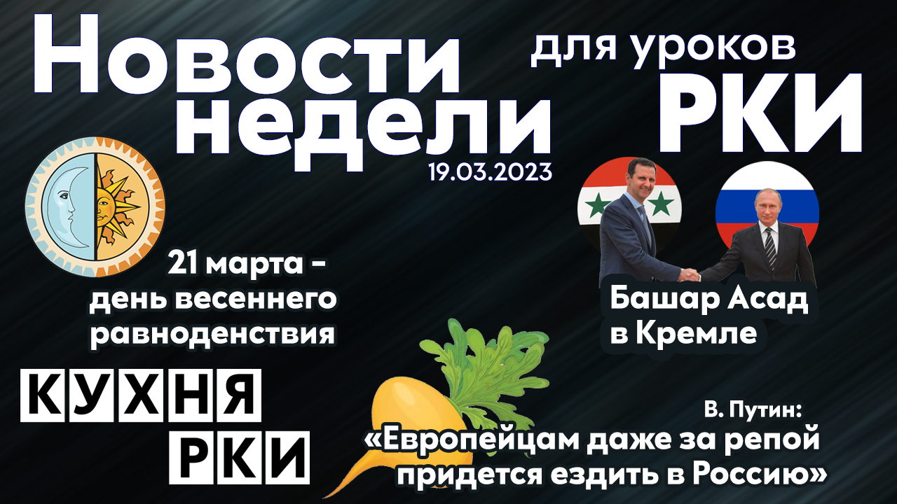 Новый выпуск новостей, адаптированных для уроков РКИ. Актуальные события недели: ? В Кремле состоялась встреча Владимира Путина с Башаром Асадом (А2-В1) ? Европейцам даже за репой придется ездить в Россию: выступление Владимира Путина на съезде РСПП (А2) ? 21 марта - день весеннего равноденствия (А2) В рабочем листе к выпуску новостей вы найдете: - упражнения, формирующие навыки чтения, аудирования, говорения; - упражнения на языковую догадку и увеличение лексического запаса; - упражнения для работы с инфографикой; - русские пословицы, сказки и многое другое! ???Скачать рабочий лист к этому выпуску новостей можно по ссылке: https://disk.yandex.ru/i/fWlFQchwLp0QEw ??? Успехов вам на занятиях! 00:00 В Кремле состоялась встреча Владимира Путина с Президентом Сирийской Арабской Республики Башаром Асадом 01:30 Европейцам даже за репой придется ездить в Россию 02:06 ВыступлениеВладимира Путина на съезде РСПП 03:26 21 марта - день весеннего равноденствия Инструкция по применению наших рабочих листов: https://rutube.ru/video/5bcd06e0f3dbfbdf27a325a4d47bef73/ Присоединяйтесь к нам в Телеграм, чтобы получать наши материалы первыми! https://t.me/kuhnarki