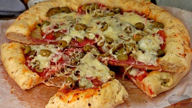СЫРНАЯ ПИЦЦА С КОЛБАСОЙ И ОЛИВКАМИ