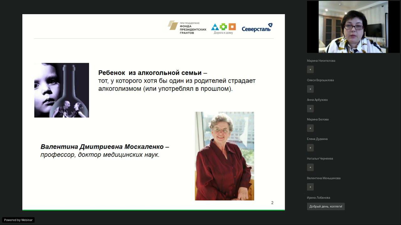 Вебинар состоялся в рамках проекта «Служба поддержки семьи и детства «Здоровая семья для ребенка» Благотворительного фонда «Дорога к дому», который реализуется с использованием средств гранта Президента РФ на развитие гражданского общества, предоставленного Фондом президентских грантов. 00:00 Начало видео 5:50 Ребёнок из алкогольной семьи 10:40 Признаки дисфункциональной семьи 23:15 Ребёнок из дисфункциональной семьи 28:41 Роли – «маски» ребёнка в семье 38:46 Маски – механизмы психологической защиты 58:53 Психологические особенности детей из алкогольной семьи 1:23:58 Формы работы с детьми в проекте 1:27:40 Наши контакты