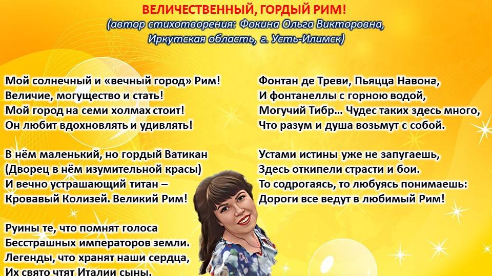 Читает автор стихотворения: ФОКИНА ОЛЬГА ВИКТОРОВНА (Иркутская область, город Усть-Илимск) СТИХИ: https://stihi.ru/2018/07/08/3790 БИОГРАФИЯ: http://www.proza.ru/2019/10/08/1473 ВЫИГРЫВАЙТЕ КНИГИ БЕСПЛАТНО: https://proza.ru/2017/09/17/447 ОТЗЫВЫ ЧИТАТЕЛЕЙ: http://www.proza.ru/2019/11/29/611 Из книги Фокиной Ольги Викторовны (Усть-Илимск) «Несу добро в ладошках!»: [все стихотворения с 2005 по октябрь 2020 гг., проза, авторские песни, интервью]. – Москва: МГО Союза писателей России, 2020 г. – 886 стр., ил. ISBN 978-5-7949-0826-8 ВЕЛИЧЕСТВЕННЫЙ, ГОРДЫЙ РИМ! (автор стихотворения: Фокина Ольга Викторовна, Иркутская область, г. Усть-Илимск) Мой солнечный и «вечный город» Рим! Величие, могущество и стать! Мой город на семи холмах стоит! Он любит вдохновлять и удивлять! В нём маленький, но гордый Ватикан (Дворец в нём изумительной красы) И вечно устрашающий титан – Кровавый Колизей. Великий Рим! Руины те, что помнят голоса Бесстрашных императоров земли. Легенды, что хранят наши сердца, Их свято чтят Италии сыны. Всевидящее око Пантеона, Что очищает души от грехов. Вершитель судеб многих Римский форум, И арок стройный ряд, скульптур, колонн. Фонтан де Треви, Пьяцца Навона, И фонтанеллы с горною водой, Могучий Тибр… Чудес таких здесь много, Что разум и душа возьмут с собой. Устами истины уже не запугаешь, Здесь откипели страсти и бои. То содрогаясь, то любуясь понимаешь: Дороги все ведут в любимый Рим! 28 марта 2020 г. Стихотворение зарегистрировано на авторские права, поэтому его цитирование возможно только с указанием полного авторства: Фокина Ольга Викторовна (г. Усть-Илимск)