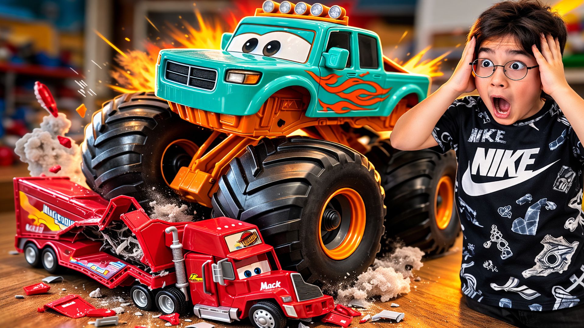 Машинка Монстр-Трак из мультика Тачки на дороге. Прыжок через Маквина - мультики про машинки!