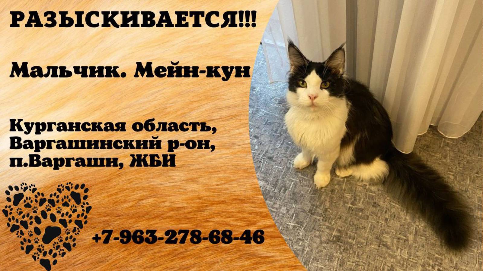 Курганская Варгаши Пропал кот 28.08 Потерялся кот в районе ЖБИ,Мейн-Кун,черно-белый.Кот домашний,улицу не знает совсем. Если увидите,звоните по номеру 89632786846 Инфо: https://vk.com/wall-198815410_151092 Автор: https://vk.com/id358997593