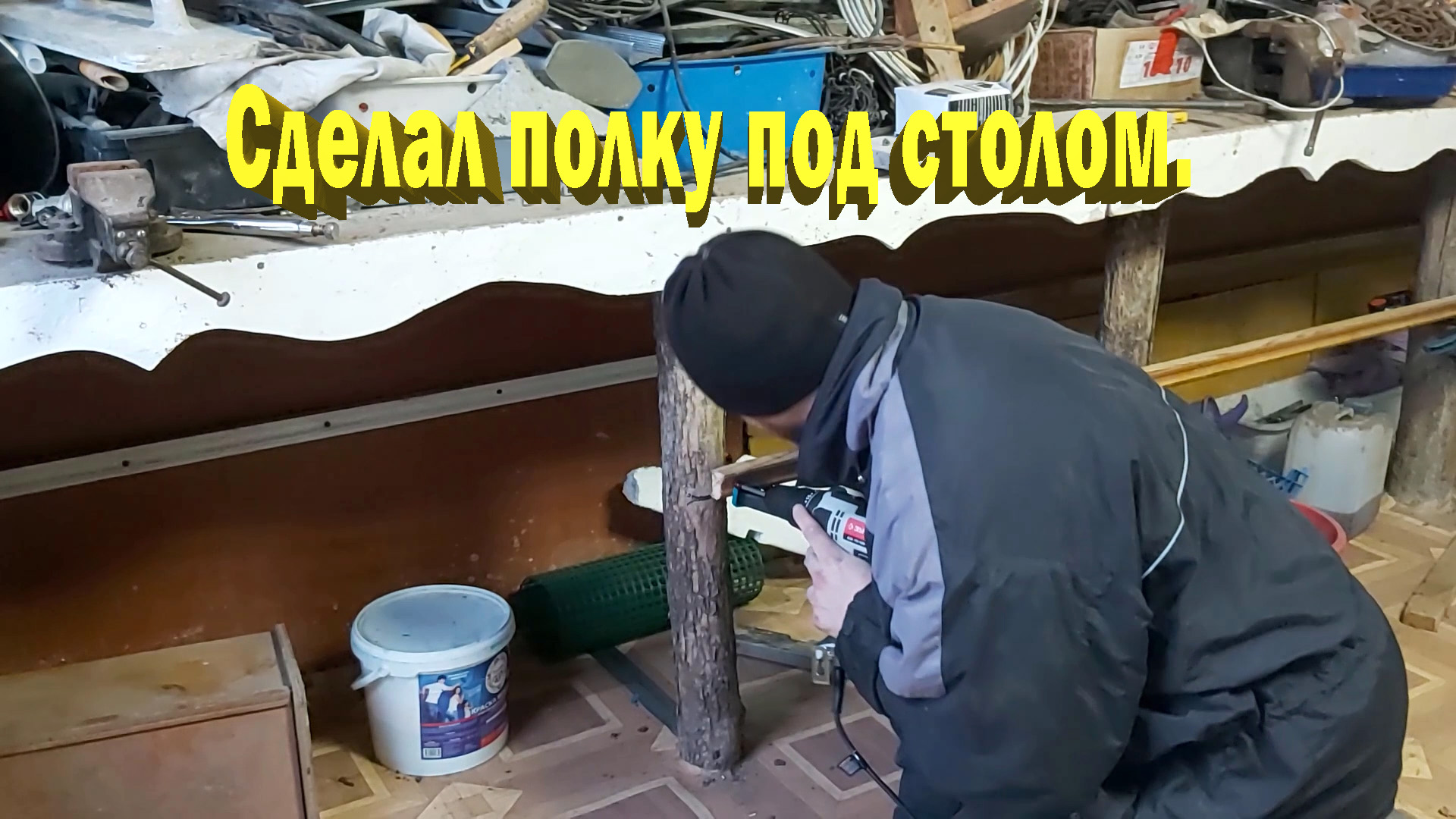 Сделал полку под столом в сарае.