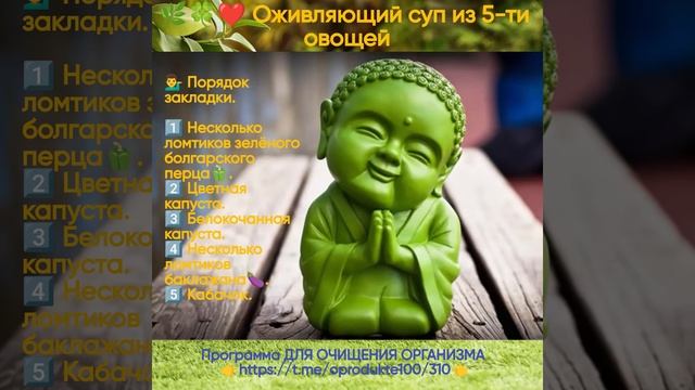 💁♂️🌿🍀❤️ Оживляющий суп из 5-ти овощей для 2-го этапа выхода из длительного голодания (больше 30 дней). Зелёные овощи варятся до мягкого состояния. Без соли. 🧑🍳 Порядок закладки. 1️⃣ Несколько ломтиков зелёного болгарского перца🫑. 2️⃣ Цветная капуста. 3️⃣ Белокочанная капуста. 4️⃣ Несколько ломтиков баклажана🍆. 5️⃣ Кабачок. Вначале на большое количество воды берётся немного овощей. Варятся двадцать, двадцать пять минут. Должны стать совсем мягкими. В следующие дни, постепенно, количество овощей можно увеличивать, а время варки уменьшать. Пока не начнёт получаться густой суп. После этого можно добавить немного оливкового масла в суп. Для начала не более полчайной ложки. Если организм отреагирует хорошо, количество масла можно немного увеличить. Через несколько дней такой диеты. Можно переходить к 3-му этапу выхода из голодания. Мой ТЕЛЕГРАМ КАНАЛ и контакты https://t.me/oprodukte100
