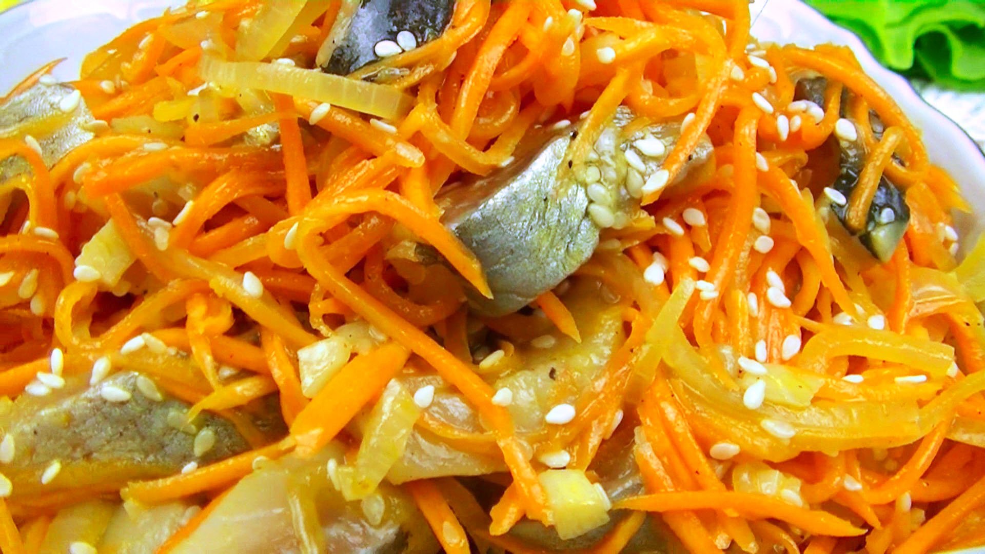 Великолепная, острая, пикантная и очень оригинальная закуска, которую ваши гости сметут со стола в два счета. Продукты: Сельдь слабосолёная - 200 гр. Морковь - 200 гр. (сладкая) Чеснок – 3 зубчика Репчатый лук – 1 шт. Кунжут белый – 2 ст. л. Растительное масло – 50 мл. Соль – щепотка Сахар – 1 ч. л. Перец чёрный молотый – 1/4 ч. л. Перец красный жгучий – ¼ ч. л. Соевый соус – 1 ст. л. (по желанию) Уксус 9% (или лимонный сок) - 1 ст . л.