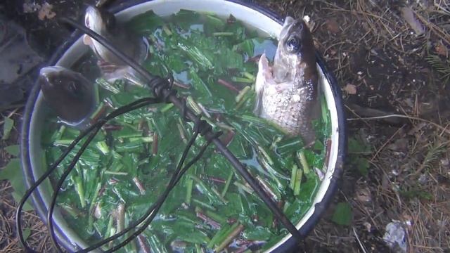 Уха в тайге. Кладем почищенный картофель и ставим на огонь, как только вскипело, кладем 4 горсти вермишели или рожек на 3 литровую кастрюлю. Даем вскипеть и варим на тихом огне до готовности картошки. Режем лук или черемшу. Закладываем черемшу или лук. Солим, добавляем печени рыб, желудочки рыбы, жирки внутренностей рыбы, сердца рыб, печень рыб и задатки молоки и икры. Ставим на огонь и как только глаза рыбы хариус побелели. Уха готова. Приятного аппетита. Уха. Таежная уха из рыбы хариус. Тайга. Рыбалка на хариуса. Ловля Хариуса.