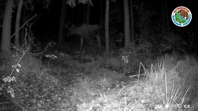07.08.2025.Лось.Заповедник Большая Кокшага.Взрослое животное ночью переходит лесную дорогу