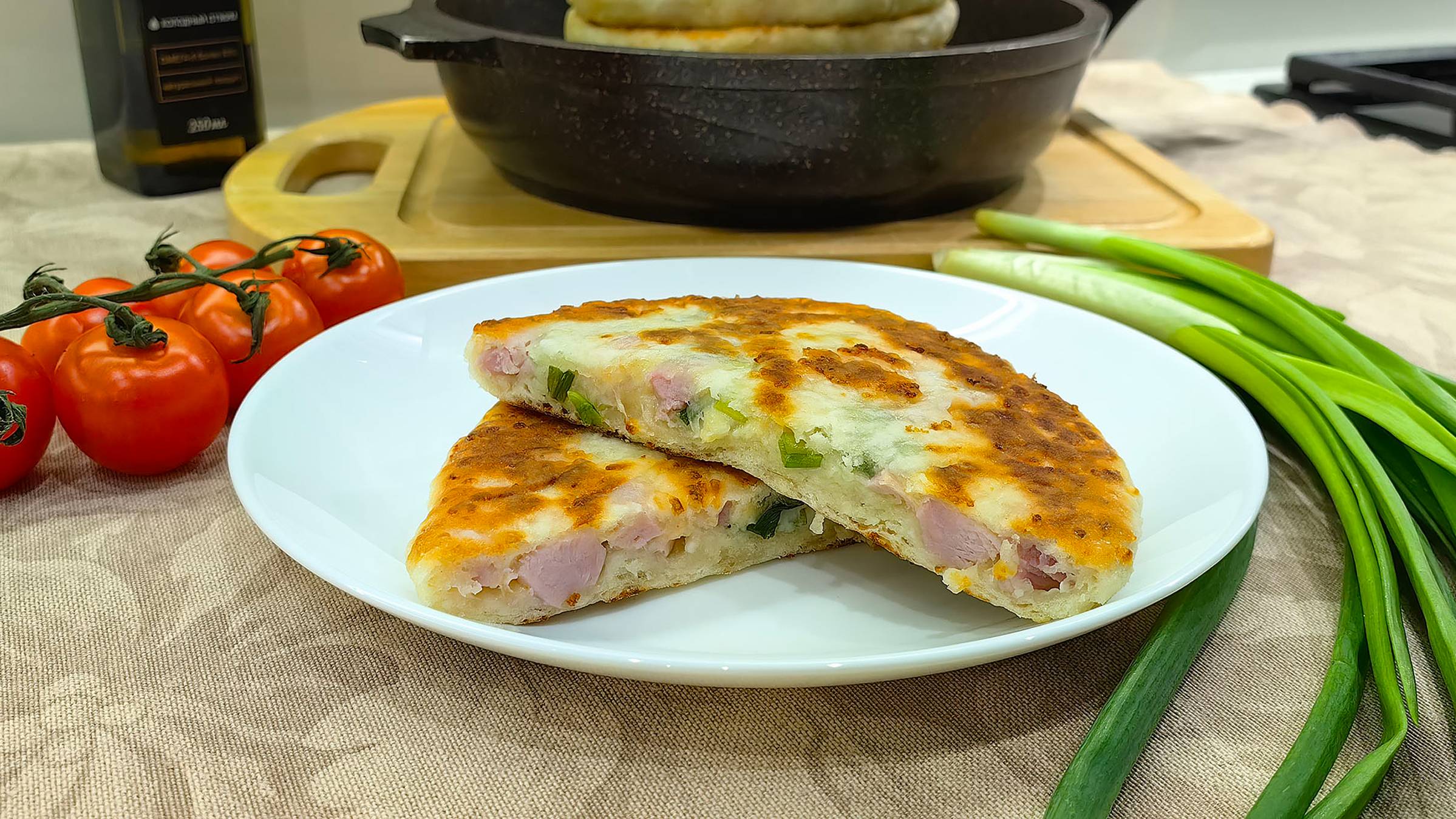 Вкусное и быстрое в приготовлении блюдо. Сырные лепешки с ветчиной и зеленью на сковороде.