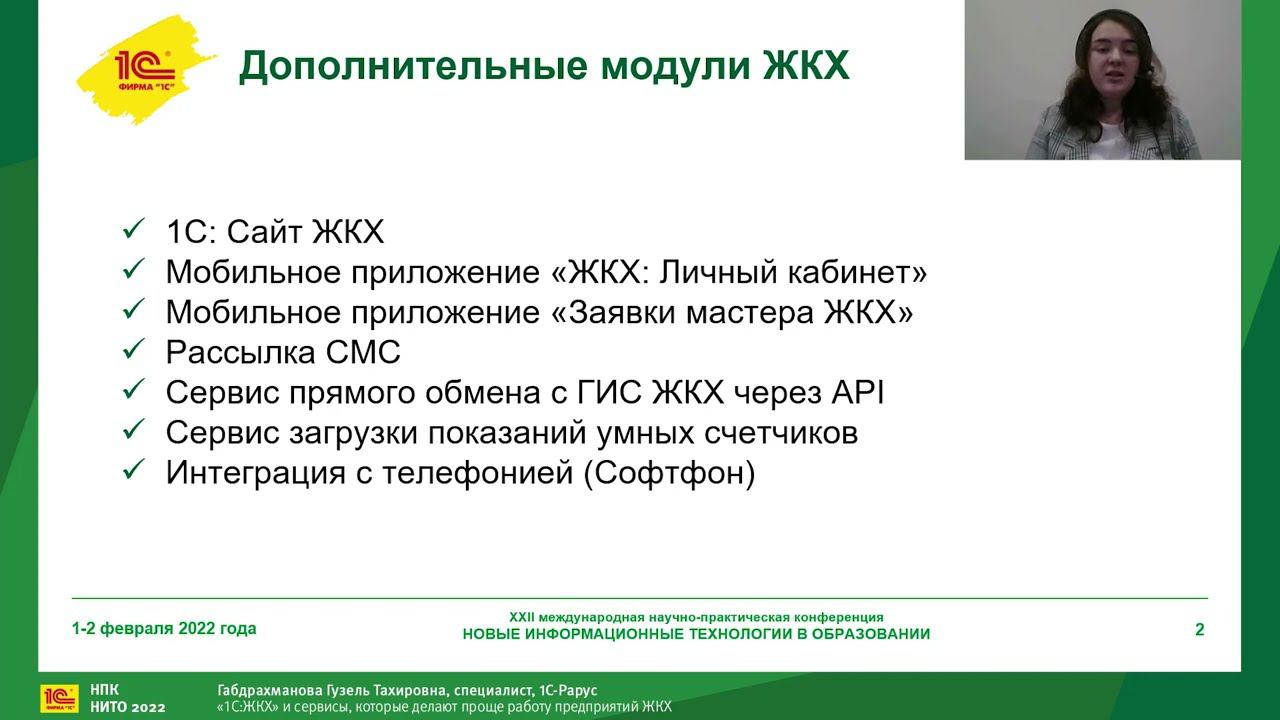 Доклад ведущего консультанта "1С-Рарус" Гузель Габдрахмановой на конференции "Новые информационные технологии в образовании", февраль 2022 г. в секции «Подготовка кадров для цифровизации строительства и ЖКХ в современных условиях» Тема доклада: «1С: ЖКХ и сервисы, которые делают проще работу предприятий ЖКХ».
