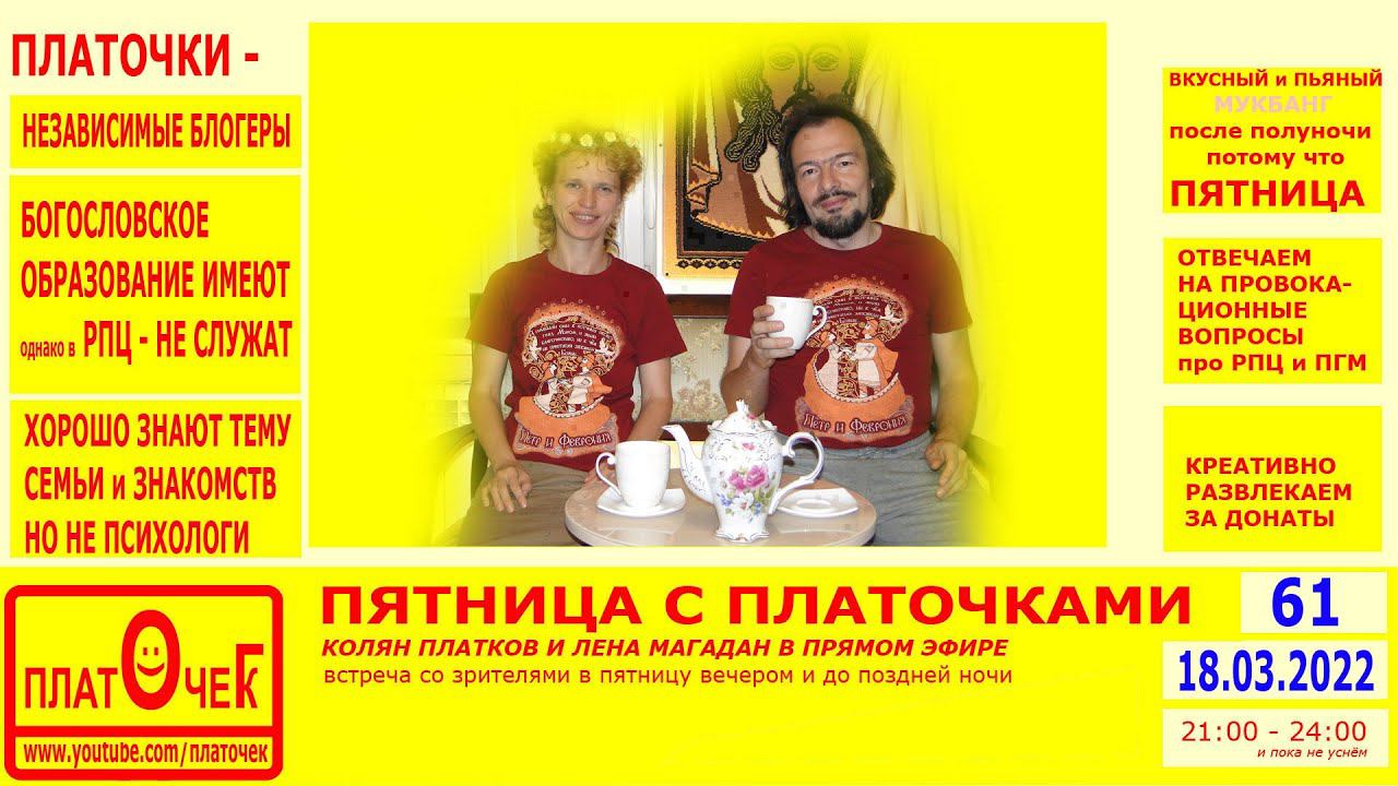 Говорим обо всём, расслабляемся, выполняем прикольные задания от зрителей за донат, отвечаем на провокационные вопросы про РПЦ и ПГМ (частное мнение светских людей с Богословским образованием) по теме "церковь и общество", "религия" и "религиозные заморочки". Весело проводим пятничный вечер. #Пятница #Мукбанг #блогеры #Православные Донат: https://donationalerts.com/r/platochekg Наш ВК: https://vk.com/kolyanplatkov Дзен: https://zen.yandex.ru/platochek Инста: https://instagram.com/platochegk ТикТок: https://www.tiktok.com/@platocheg