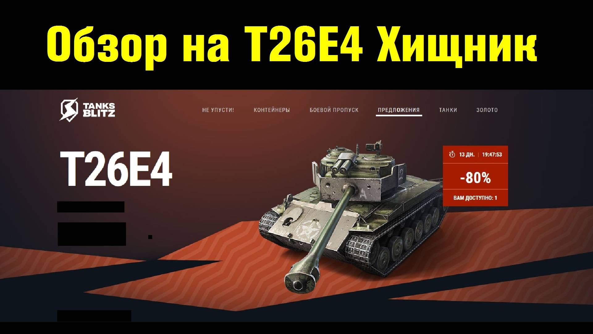 В этом видео я рассказываю о танке Т26Е4 Хищник, который появился в продаже за реальный прайс в игре Tanks Blitz. TanksBlitz Обзоры танков (плейлист): https://rutube.ru/plst/445862/ Мой канал ВКонтакте: https://vk.com/oneshot_play1 Мой канал на YouTube: https://www.youtube.com/@OneShot_Play Мой второй канал по играм: https://rutube.ru/channel/41302499/ Ставьте лайки, рассказывайте друзьям и обязательно комментируйте! =)