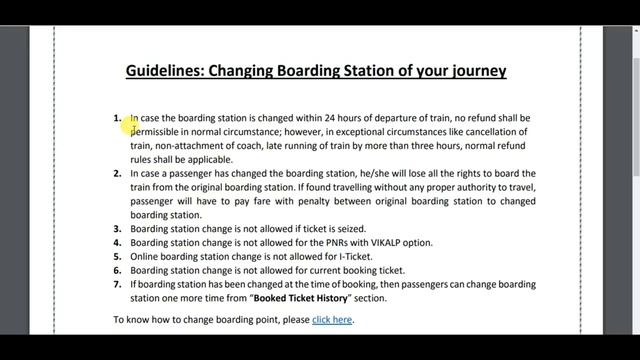 HELLO AND WELCOME FRIENDS HELPFULL RASTA CHANNEL ME APKA BAHOT BAHOT SWAGAT KARTA HU DOSTO AAJ MAI APKO BATAUBGA KI AGAR AAP IRCTC SE TICKET BOOK KARTE HAI TO IRCTC INDIAN RAILWAY NE BOARDING POINT CHANGE KARNE KE 7 NAYE NIYAM LE KAR AAYI HAI JISME APKO BOARDING STATION CHANGE KARNE SE PAHLE YE 7 NAYE NIYAM KE BAARE ME PATA HONA CHAHIYE TABHI APKO BOARDING POINT CHANGE KARNA CHAHIYE OK DOSTO IS VIDEO ME AGAR KUCH NA SAMJH AYA HO TO AAP COMMENT ME JA KAR PUCH SAKTE HAI AUR VIDEO KO LIKE KAREN AUR HELPFULL RASTA KO SUBSCRIBE ZARUR KARE THANK YOU SO MUCH FOR WATCHING. #IRCTCNEWRULE #BOARDINGPOINT @@@@@@@RELATED LINK COVER THIS VIDEO@@@@@@@@ Change Boarding Station Before 4 hours From Travel Time | Irctc Train Ticket Booking 7 Rule Guidelines: Changing Boarding Station of your journey 1. In case the boarding station is changed within 24 hours of departure of train, no refund shall be permissible in normal circumstance; however, in exceptional circumstances like cancellation of train, non-attachment of coach, late running of train by more than three hours, normal refund rules shall be applicable. 2. In case a passenger has changed the boarding station, he/she will lose all the rights to board the train from the original boarding station. If found travelling without any proper authority to travel, passenger will have to pay fare with penalty between original boarding station to changed boarding station. 3. Boarding station change is not allowed if ticket is seized. 4. Boarding station change is not allowed for the PNRs with VIKALP option. 5. Online boarding station change is not allowed for I-Ticket. 6. Boarding station change is not allowed for current booking ticket. 7. If boarding station has been changed at the time of booking, then passengers can change boarding station one more time from “Booked Ticket History” section. @@@@@@@@@@@HELPFULL RASTA@@@@@@@@@@@ LIKE | COMMENT | SHARE | SUBSCRIBE YOUTUBE https://www.youtube.com/channel/UC0t2... GMAIL helpfullrasta@gmail.com GOOGLE+ https://plus.google.com/u/0/101552503... FACEBOOK https://www.facebook.com/helpfull.rasta TWITTER https://twitter.com/HelpfullRasta INSTAGRAM https://www.instagram.com/helpfullrasta/