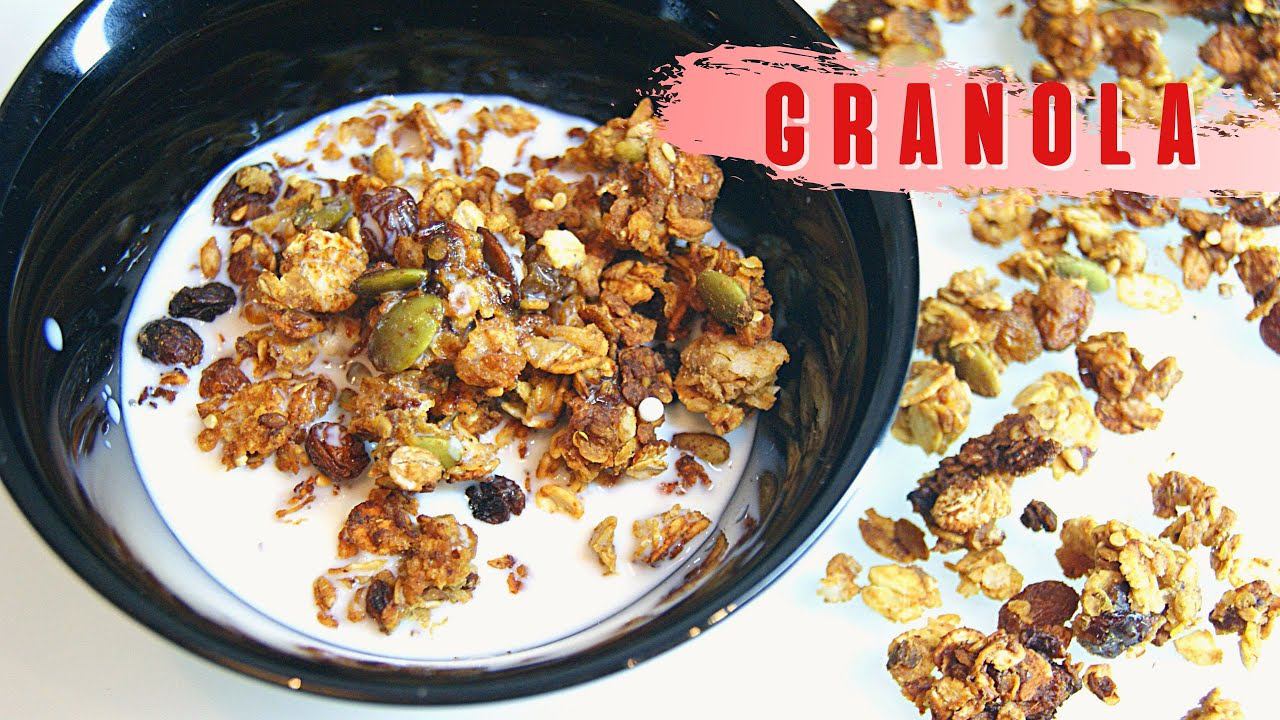 Гранолу можно готовить из любых видов хлопьев овсяных, гречневых, кукурузных, я предлагаю вариант приготовления гранолы с хлопьями 5 злаков. Таким образом гранола будет более насыщенна и разнообразна питательными компонентами. Чтобы гранола приобрела свой аппетитный хруст и комочки, в рецепте буду использовать сладость фиников и липкость арахисовой пасты. Если арахисовой пасты нет, не беда, можно приготовить так же просто из фиников и воды. #гранолабезмеда,#гранолабезсахара,#граноларецепт ************************************************************************** Вкусно — с пользой для фигуры! Пусть правильно питание, с легкостью, станет вашим образом жизни. **************************************************************************** 100 гр./376 ккал Б-11 Ж-14 У-56 Ингредиенты: 100 гр. - хлопья 5 злаков 20 гр. - изюм 20 гр. - тыквенные семечки 5 гр. - кунжут 6 шт. - финики 80 мл. - вода 40 гр. - арахисовая паста соль ваниль стевия/сахарозаменитель _._._._._._._._._._._._._._._._._._._._._._._._._._._._._._._._._._._._._._._._._._._._._._._._._._._._._._. На моем канале пп рецепты на любой вкус. Благодарю всех, знакомых и незнакомых друзей, зашедших на мой канал Granola - useful menu. Ответы в виде ЛАЙКОВ, сообщений и комментариев вдохновляют меня, на создание новых видео для ВАС.