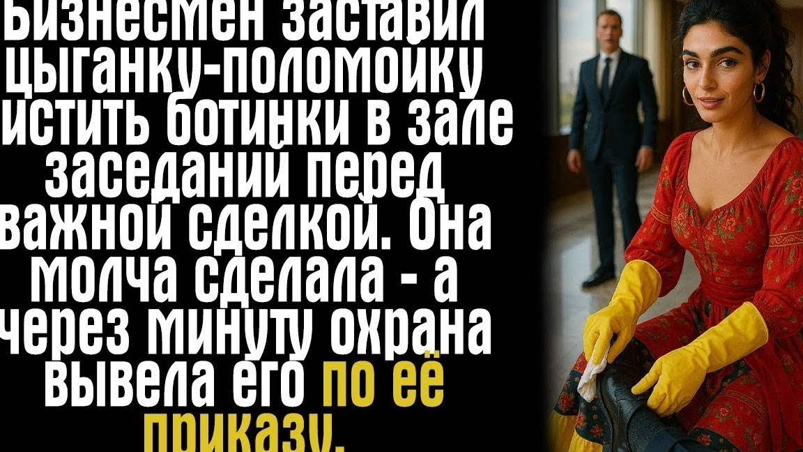 Бизнесмен заставил цыганку-поломойку чистить ботинки в зале заседаний перед важной сделкой. Она...