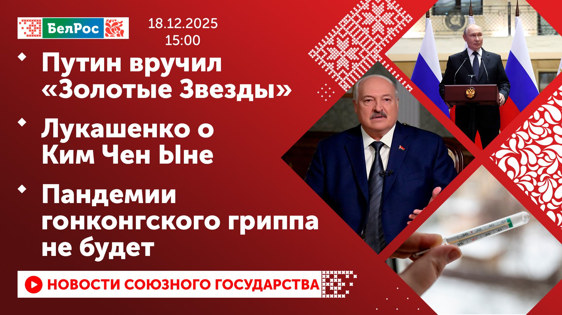 Закадровый текст озвучивает *ИИ Антон* Новости 18.12.2025 на 15:00 - Владимир Путин вручил медали "Золотая Звезда" участникам СВО. - Александр Лукашенко высказал своё мнение о пяти мировых лидерах. - Президент Беларуси: Си Цзиньпин умный и аккуратный человек. - Лукашенко: Трамп может войти в историю как самый миролюбивый Президент США. - Александр Лукашенко назвал Ким Чен Ына абсолютно нормальным человеком. - Президент Беларуси: Зеленский вменяемый человек, но неопытный. - Геннадий Онищенко заявил об отсутствии пандемии гриппа в России. Смотрите главные новости Союзного государства на телеканале БелРос. Ссылки на наши соц. сети Сайт: http://belros.tv/ Telegram: https://t.me/belrostv Одноклассники: https://ok.ru/group/55657426976918 ВКонтакте: https://vk.com/belrostv TikTok: https://www.tiktok.com/@belros_tv?_t=... RuTube: https://rutube.ru/channel/23501830/ Яндекс. Дзен: https://zen.yandex.ru/belrostvv Наши подкасты на Яндекс. Музыке: https://music.yandex.ru/album/25615251 #главныеновости #новостисегодня #СоюзноеГосударство
