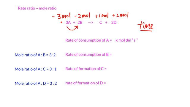 36.1 Introduction to rate A. Reactions have different reactions Very fast reaction: H2 + O2 – H2O (Explosive) Fast reaction : Mg + 2HCl – MgCl2 + H2 (React immediately) Slow reaction: Rusting: 4Fe + 3O2 + 2nH2O – 2Fe2O3.H2O (Takes week) B. Why do we study rate of reaction? So we can alter the rate of reaction. Favorable reaction (e.g. produce industrial): Speed up , produce product faster Unfavorable reaction (e.g. decay of food) : Slow down C. Rate of reaction Rate of reaction = change in conc of chemical / time Unit: mol dm-3 s-1 ✘ M s-1 Other possible unit: g min-1 / dm3 s-1 D. Mole ratio same as Rate ratio If mole ratio of A: B= 3: 4, Rate of A : Rate of B = 3: 4 E. Presentation Reactant : Rate of consumption of B // Rate of reaction = + x mol dm-3 s-1 Product: Rate of formation of A // Rate of reaction = - x mol dm-3 s-1