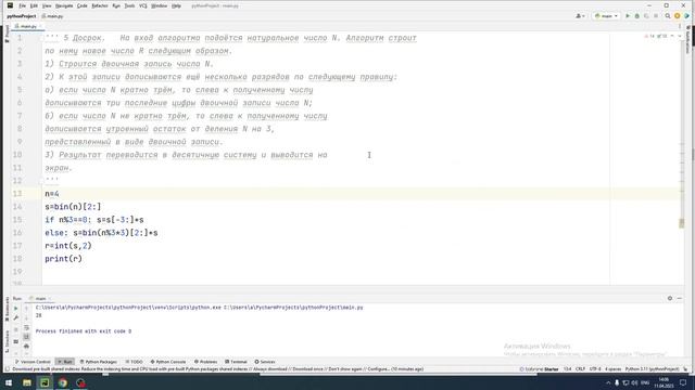 На вход алгоритма подаётся натуральное число N. Алгоритм строит по нему новое число R следующим образом. 1) Строится двоичная запись числа N. 2) К этой записи дописываются ещё несколько разрядов по следующему правилу: а) если число N кратно трём, то слева к полученному числу дописываются три последние цифры двоичной записи числа N; б) если число N не кратно трём, то слева к полученному числу дописывается утроенный остаток от деления N на 3, представленный в виде двоичной записи. 3) Результат переводится в десятичную систему и выводится на экран. При каком наименьшем числе N в результате работы алгоритма получится R больше 125? материалы https://disk.yandex.ru/d/0xW8UuT8z5Gw5w for n in range(4, 1000): s=bin(n)[2:] if n%3==0: s=s[-3:]+s else: s=bin(n%3*3)[2:]+s r=int(s,2) if r больше 125: print(n) break