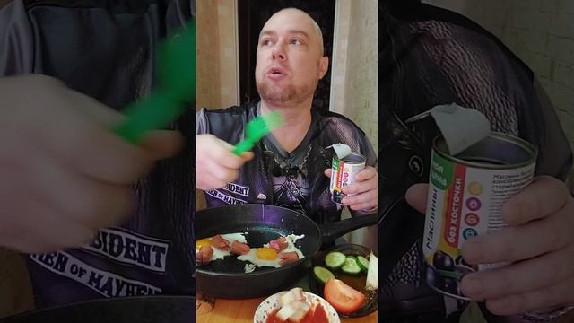 Мукбанг. Яичница в сковородке с сосисками. Плюс сало с