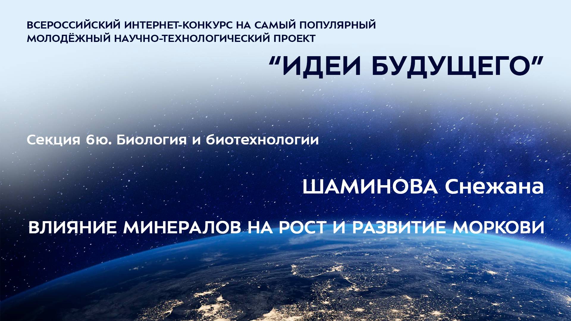 (6Ю-38) ШАМИНОВА Снежана Батырхановна Челябинская область, г. Карталы МОУ «СОШ № 45», 5 класс ВЛИЯНИЕ МИНЕРАЛОВ НА РОСТ И РАЗВИТИЕ МОРКОВИ Научный руководитель: Шаминова Валентина Григорьевна, Челябинская область, г. Карталы, МОУ «СОШ № 45», педагог Более подробно о мероприятиях Программы "Шаг в будущее" можно узнать на сайтах http://www.step-into-the-future.ru/ и http://шагвбудущее.рф