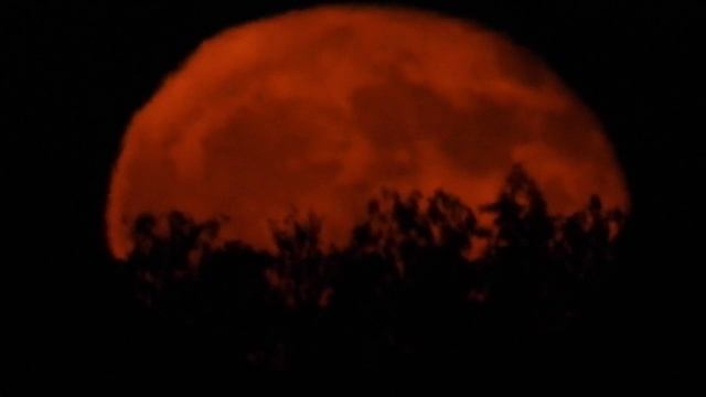 Красная огромная Луна зрелищно восходит над горизонтом