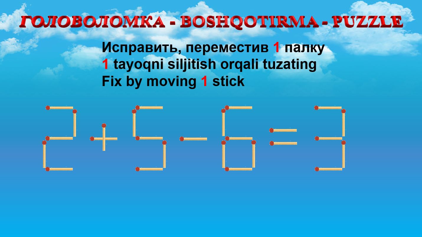 ГОЛОВОЛОМКА - BOSHQOTIRMA – PUZZLE. Спичка. 2+5-6=3, 9-2+5=7, 4-5+2=7, 6-2+4=11