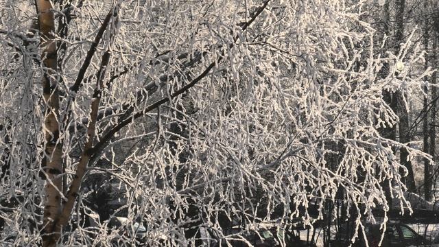 Красивая зима в городе. Мороз и солнце. Пушистый снег на ветках деревьев.