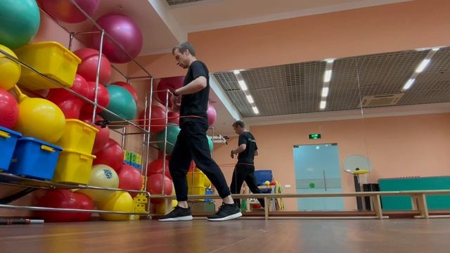 Одна нога впереди, вторая сзади, туловище вертикально; ширину ног выбрать так, чтобы человек мог сохранить корректное положение таза, без вращения и наклона. Прокинуть амортизатор вокруг таза. Создать предварительное натяжение. Начать движение таза влево, амортизатор утягивать вправо. Затем повторить в другую сторону, вперед и назад, амортизатор, соответственно утягивать влево, назад и вперед. Сменить положение ног.