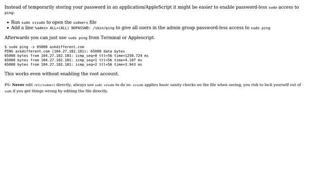 Apple: How to save the sudo password in AppleScript? Helpful? Please support me on Patreon: https://www.patreon.com/roelvandepaar With thanks & praise to God, and with thanks to the many people who have made this project possible! | Content (except music & images) licensed under CC BY-SA https://meta.stackexchange.com/help/licensing | Music: https://www.bensound.com/licensing | Images: https://stocksnap.io/license & others | With thanks to user Todd (apple.stackexchange.com/users/370591), user nohillside (apple.stackexchange.com/users/9058), user klanomath (apple.stackexchange.com/users/93229), and the Stack Exchange Network (apple.stackexchange.com/questions/387966). Trademarks are property of their respective owners. Disclaimer: All information is provided "AS IS" without warranty of any kind. You are responsible for your own actions. Please contact me if anything is amiss at Roel D.OT VandePaar A.T gmail.com